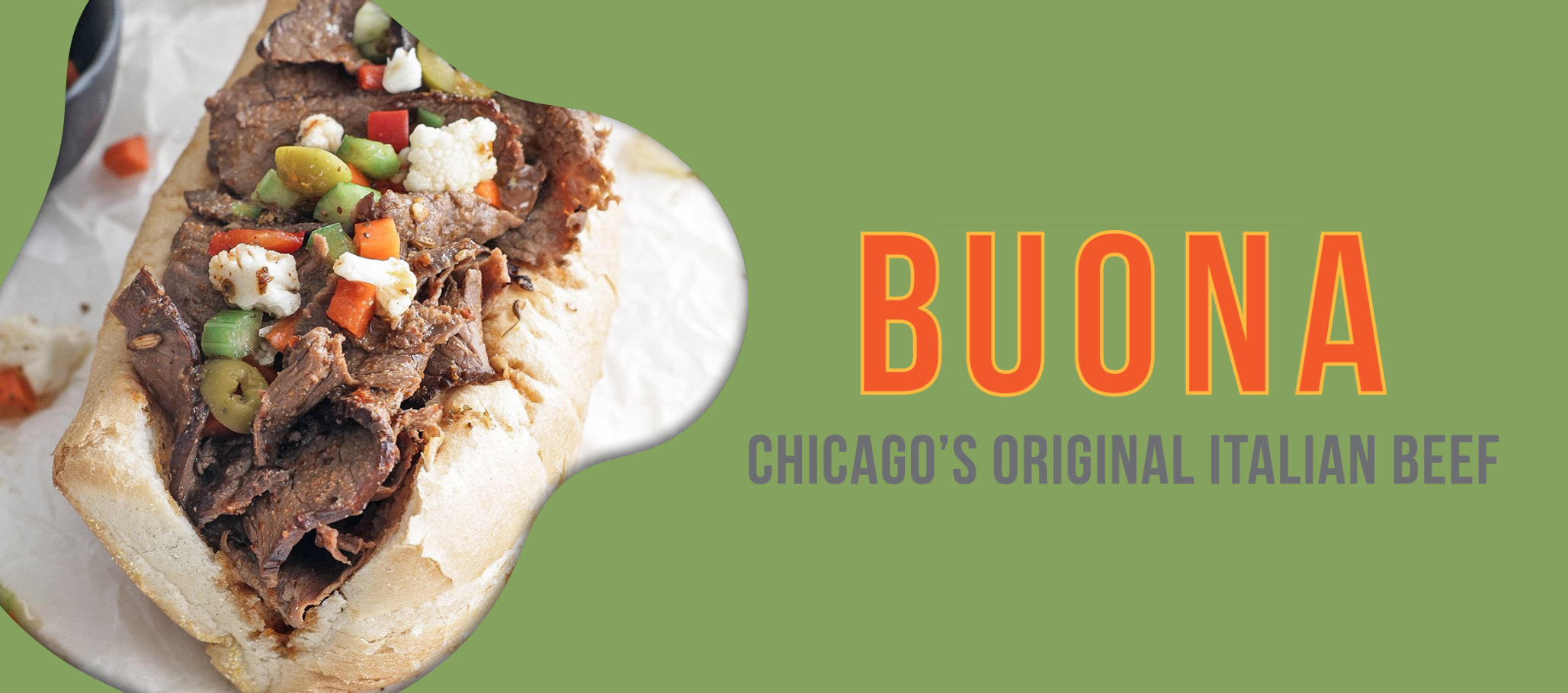 The Buona Chicago Style Mild Giardiniera (16 oz) & Buona Italian Beef with Gravy (68 oz) Combo Pack by Buona is displayed outdoors on a wooden surface along with a classic Chicago Italian beef sandwich.The Buona Chicago Style Mild Giardiniera (16 oz) & Italian Beef with Gravy (68 oz) Combo Pack, both branded by Buona, are shown on a wooden kitchen surface—perfect for creating authentic Chicago Italian beef at home.