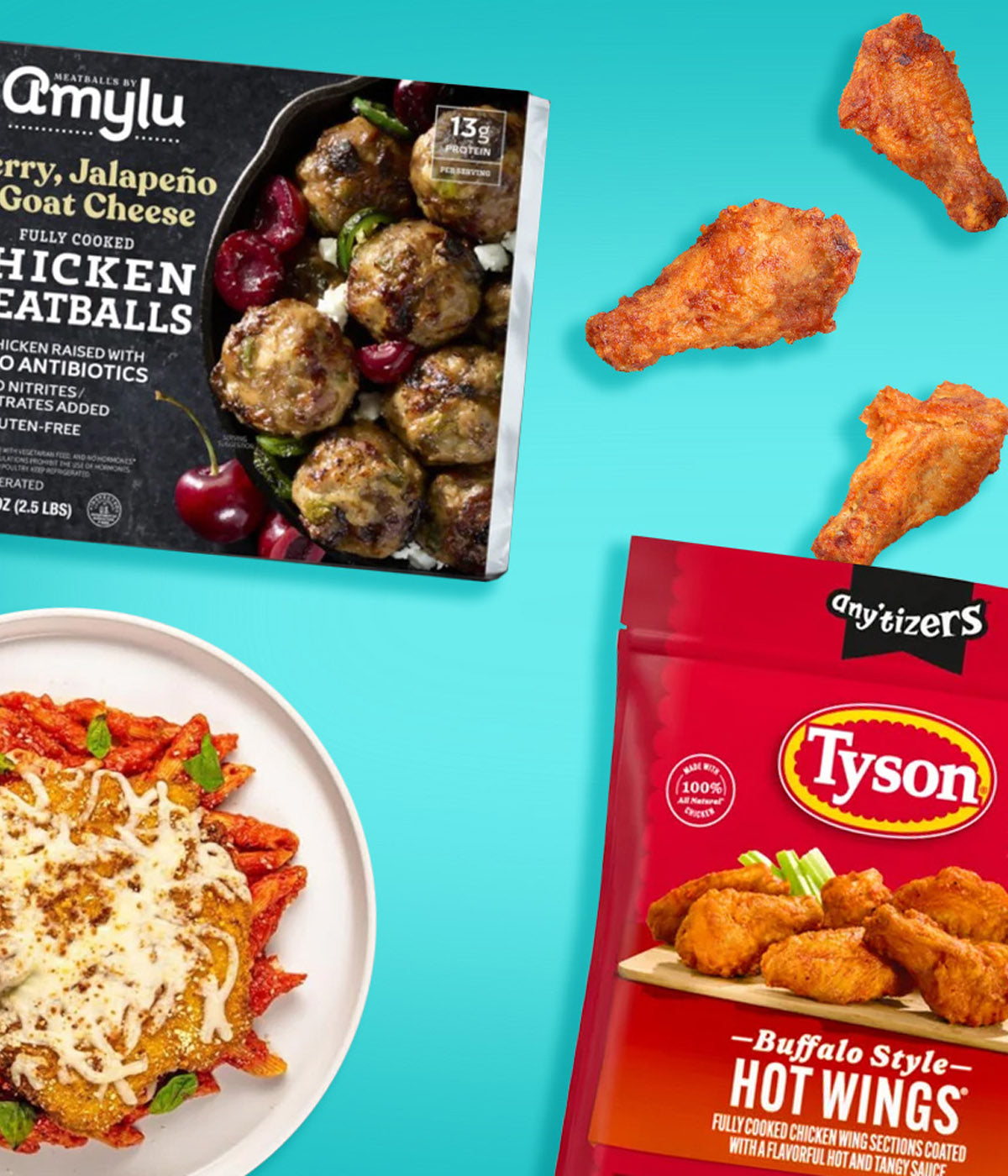 A box of Amylu ABF Chicken Meatballs with Parmesan & Basil (46 oz) rests on a kitchen counter, showcasing nutrition and ingredient details for these antibiotic-free, gluten-free Amylu chicken meatballs.