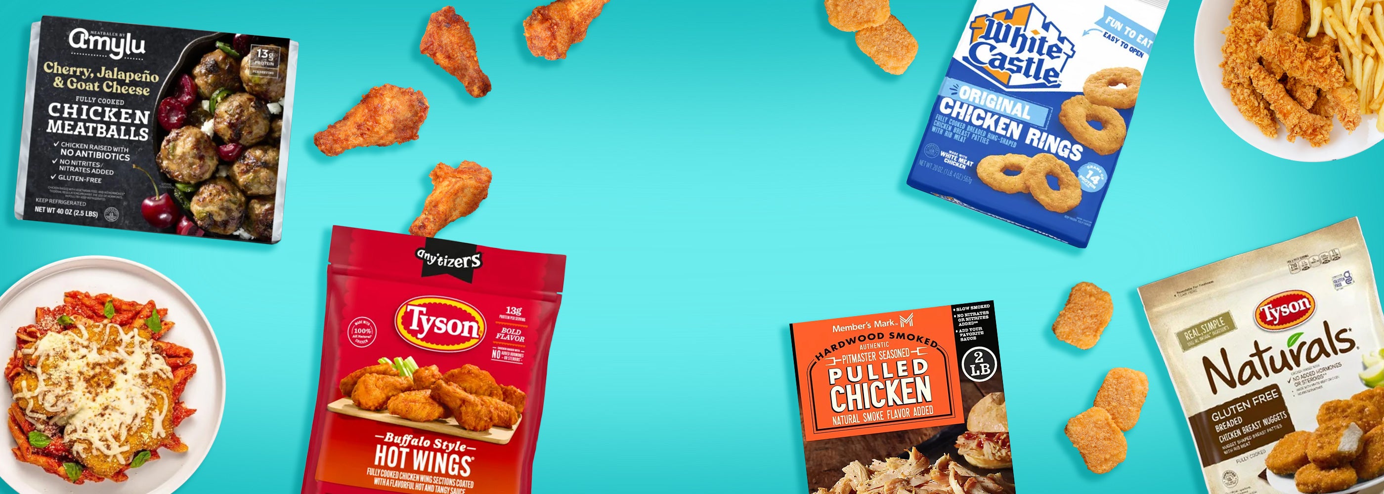 A package of Tyson White Meat Chicken Nuggets, Frozen, 5 lbs, is displayed on a wooden surface. In front, a plate of protein-packed chicken nuggets with a side of ketchup, a fork, and a knife is shown.A 5-pound package of Tyson White Meat Chicken Nuggets, Frozen is displayed on a light-colored wooden surface, with a few protein-packed nuggets and carrot sticks dipped in ketchup shown at the top left of the packaging.