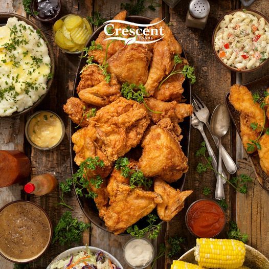 A 3 lb bag of Crescent Foods Chicken Breast Breaded Tenders rests on a wooden table outdoors, with a sunset and blurred landscape in the background.A bag of Crescent Foods Chicken Breast Breaded Tenders – 3 lbs is shown outdoors on a wooden surface, with the back displaying nutrition facts and instructions.