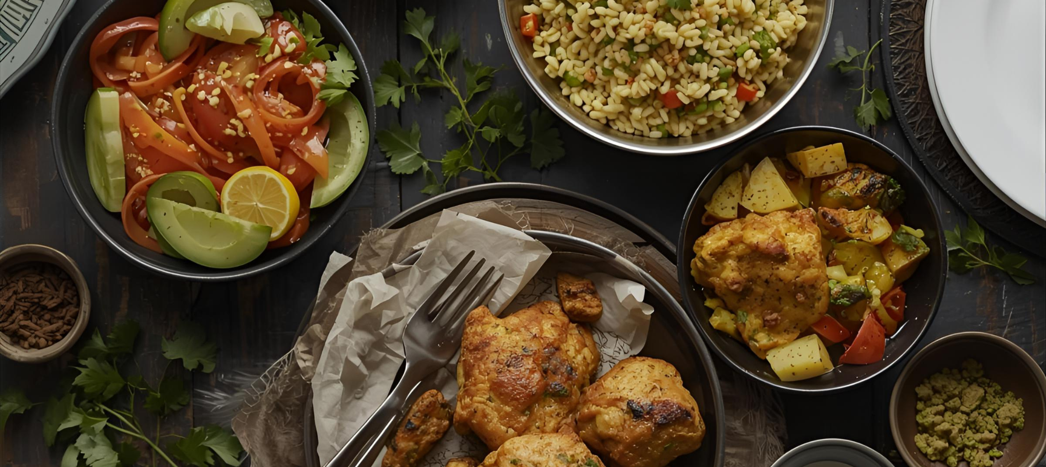 A box of Sysco Chicken Breast Skewer Grilled Halal, rich in roasted flavor, sits on a wooden kitchen counter amidst a bustling kitchen backdrop.